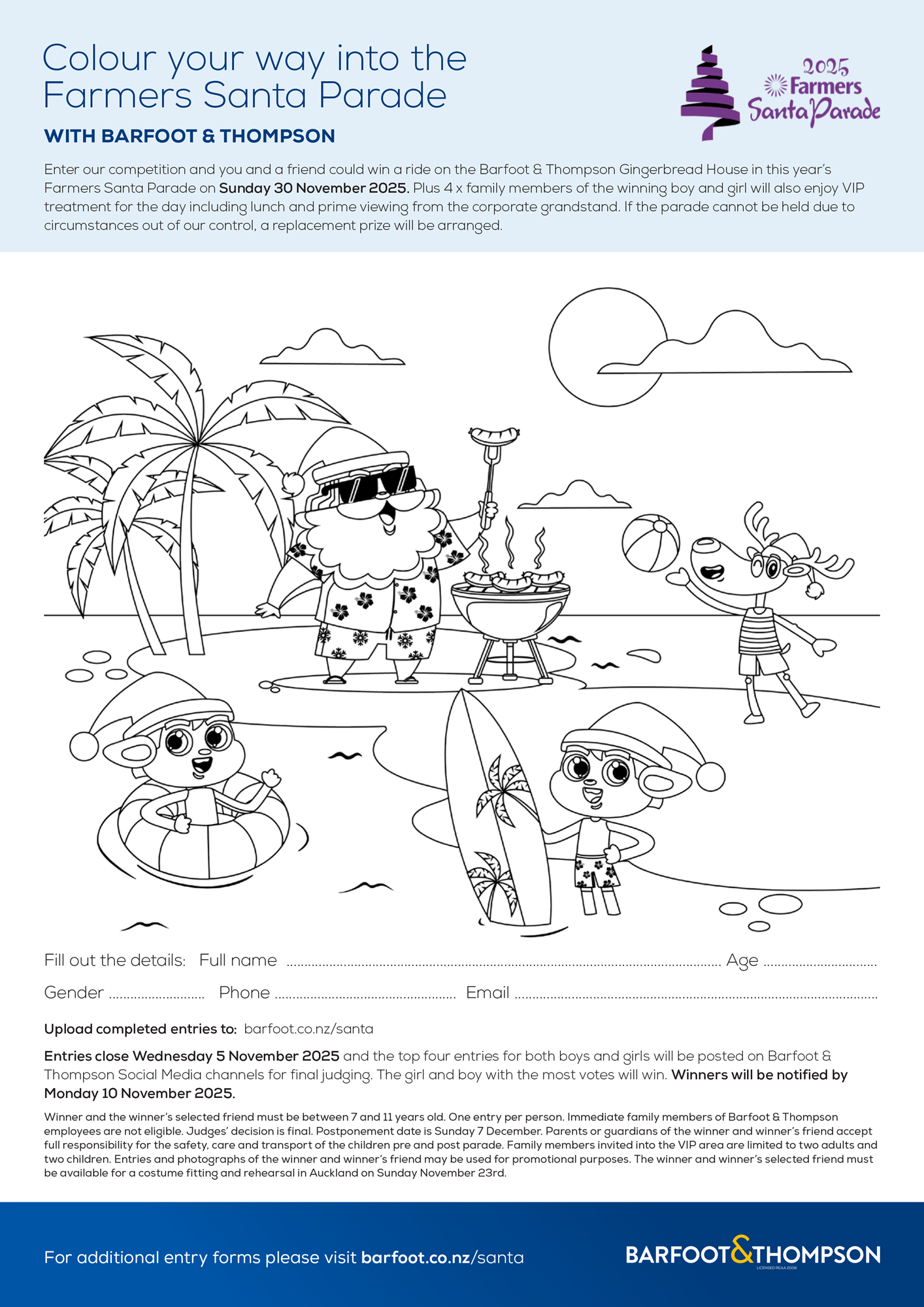 - Entries close Wednesday 5 November 2025 and the top four entries will be posted on Barfoot & Thompson's Social Media channels. The girl and boy with the most votes will win.